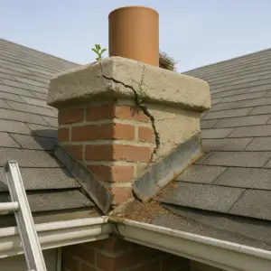 Water leaks develop from cracked crowns, damaged flashing, or deteriorated mortar. Moisture penetration, combined with freezing and thawing, accelerates deterioration, causing extensive damage. Look for water stains, rusted fireplace components, and crumbling masonry.
